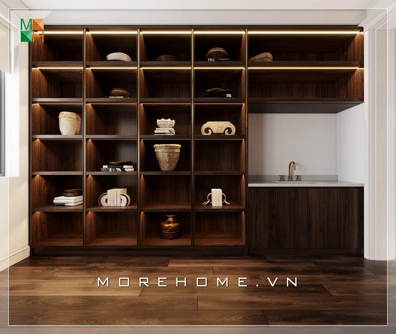 Kệ tủ gỗ công nghiệp hiện đại trưng bày sắp xếp những món đồ, cuốn sách yêu thích tô điểm thẩm mỹ cao cho không gian phòng